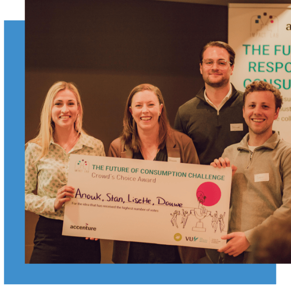 Anouk Holch, Stan Meekel, Lisette Lokers, and Douwe Borren were awarded the Crowd’s Choice Award; their ‘Stop Wasting Food at Work’ idea received the most votes on the platform. They proposed creating a gamified learning environment to help corporations reduce food waste.